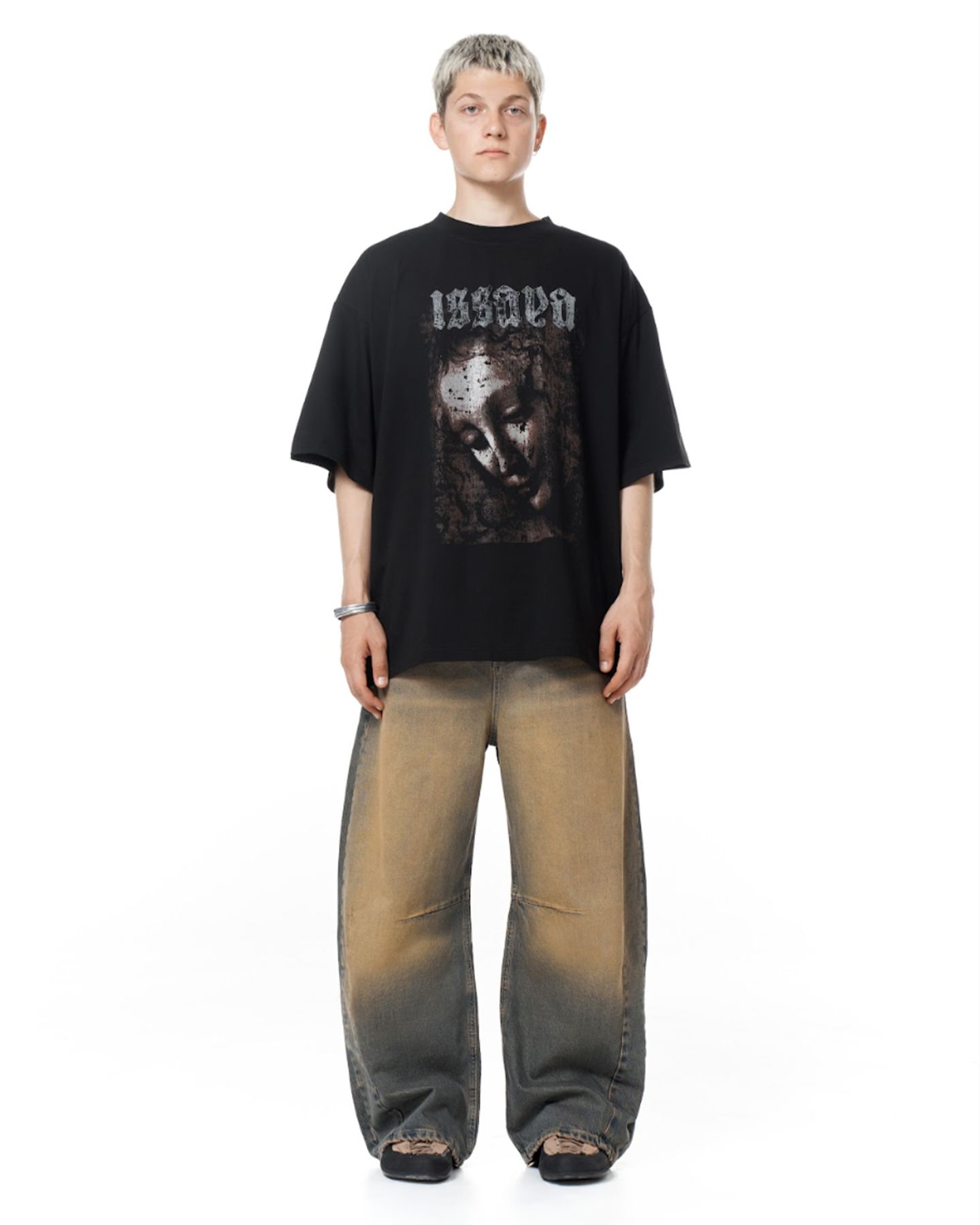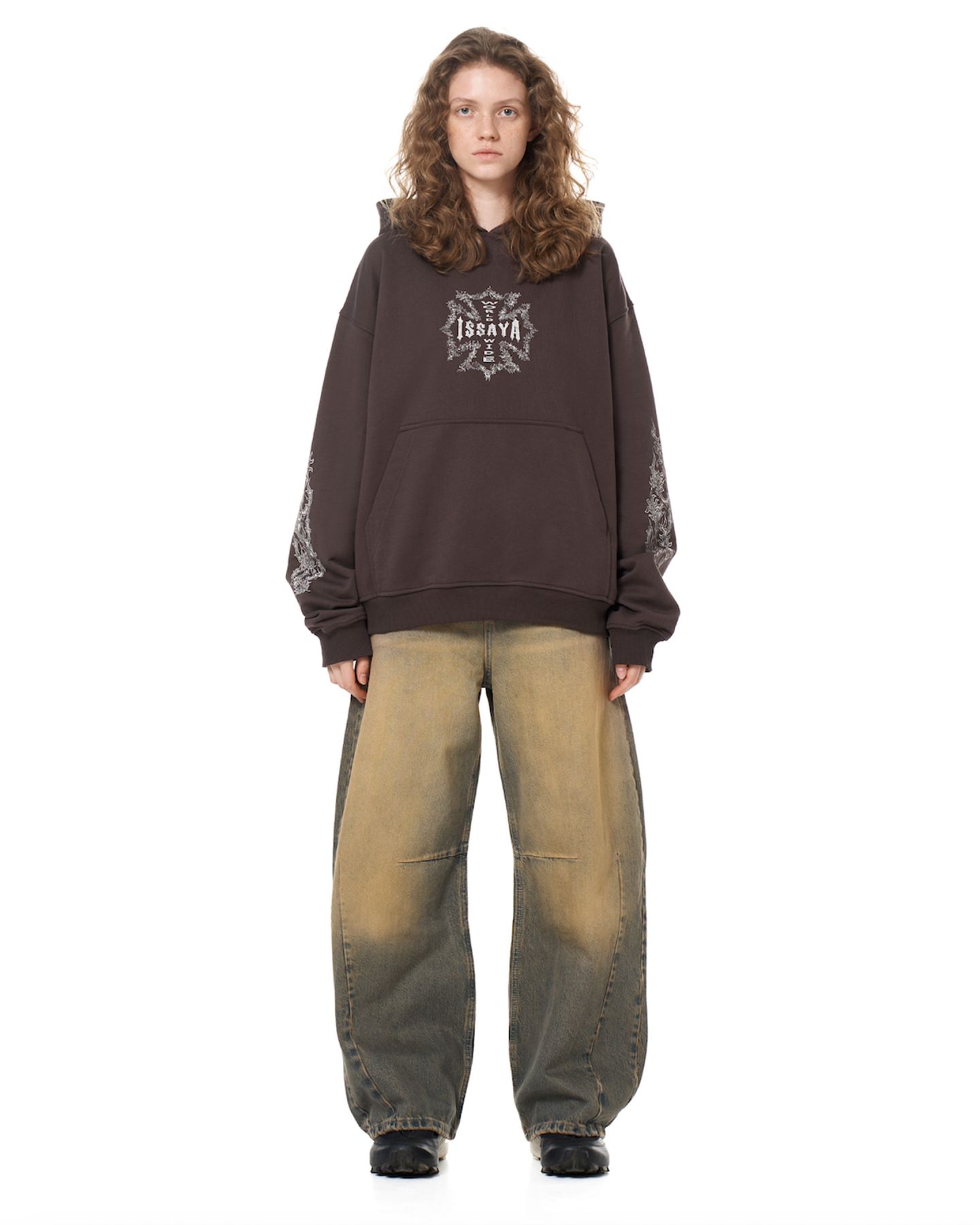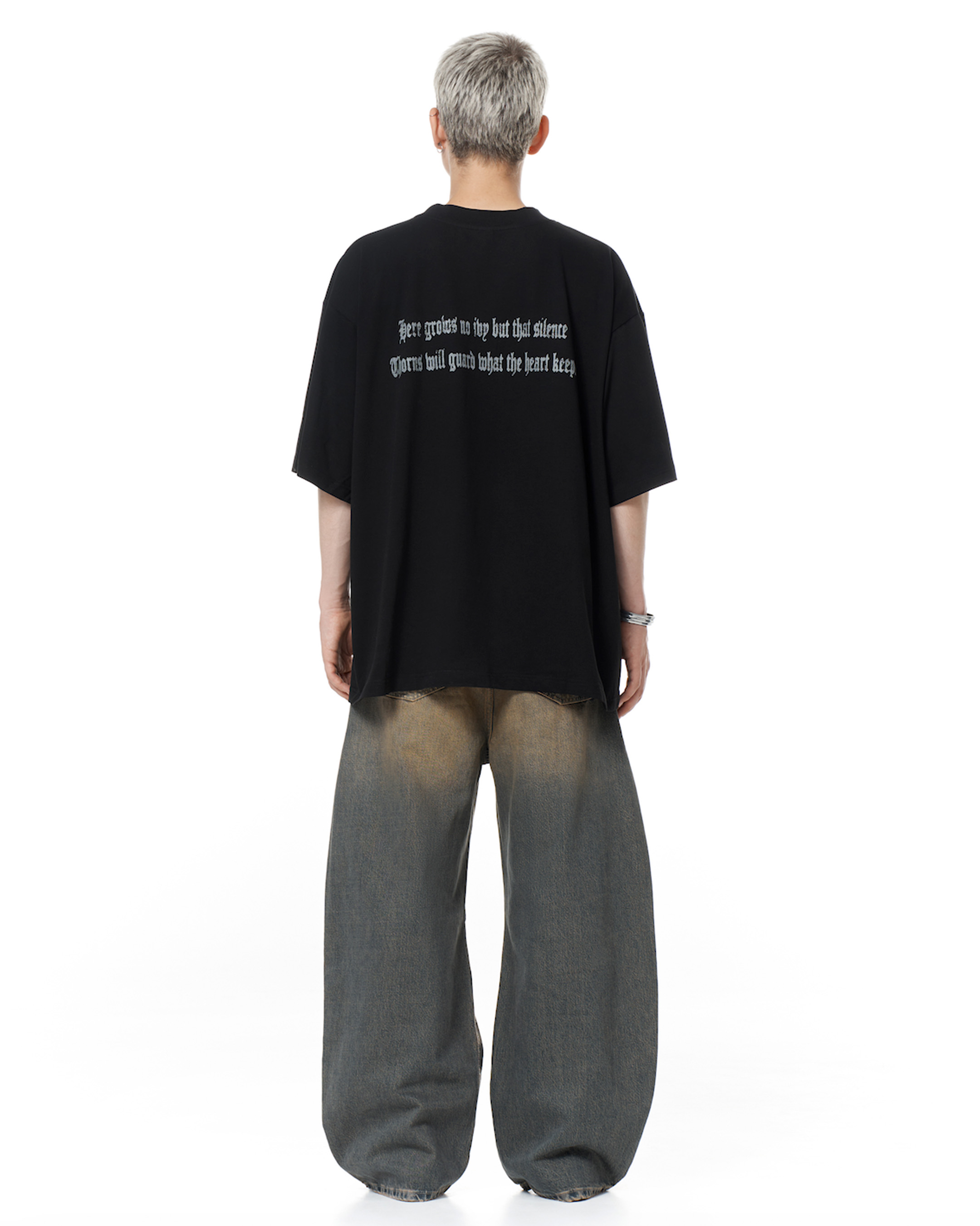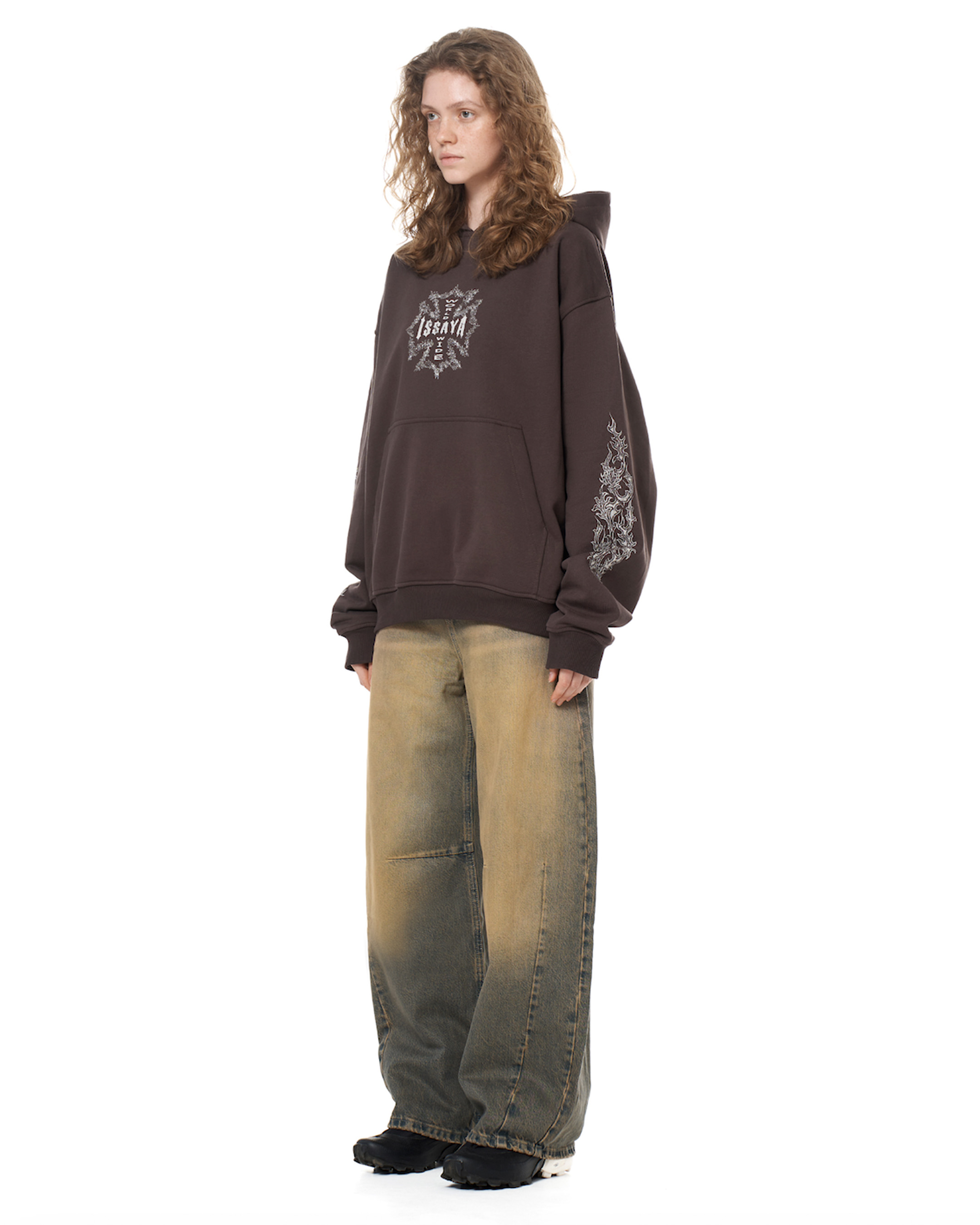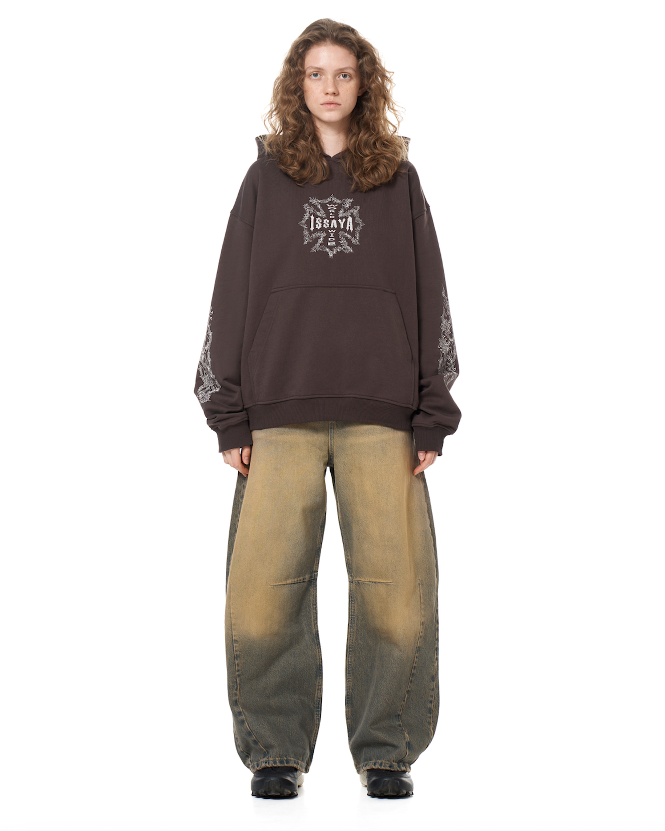 Модель оверсайз-кроя с уникальной расцветкой, полученной за счёт многоступенчатой обработки без повреждения текстуры ткани.