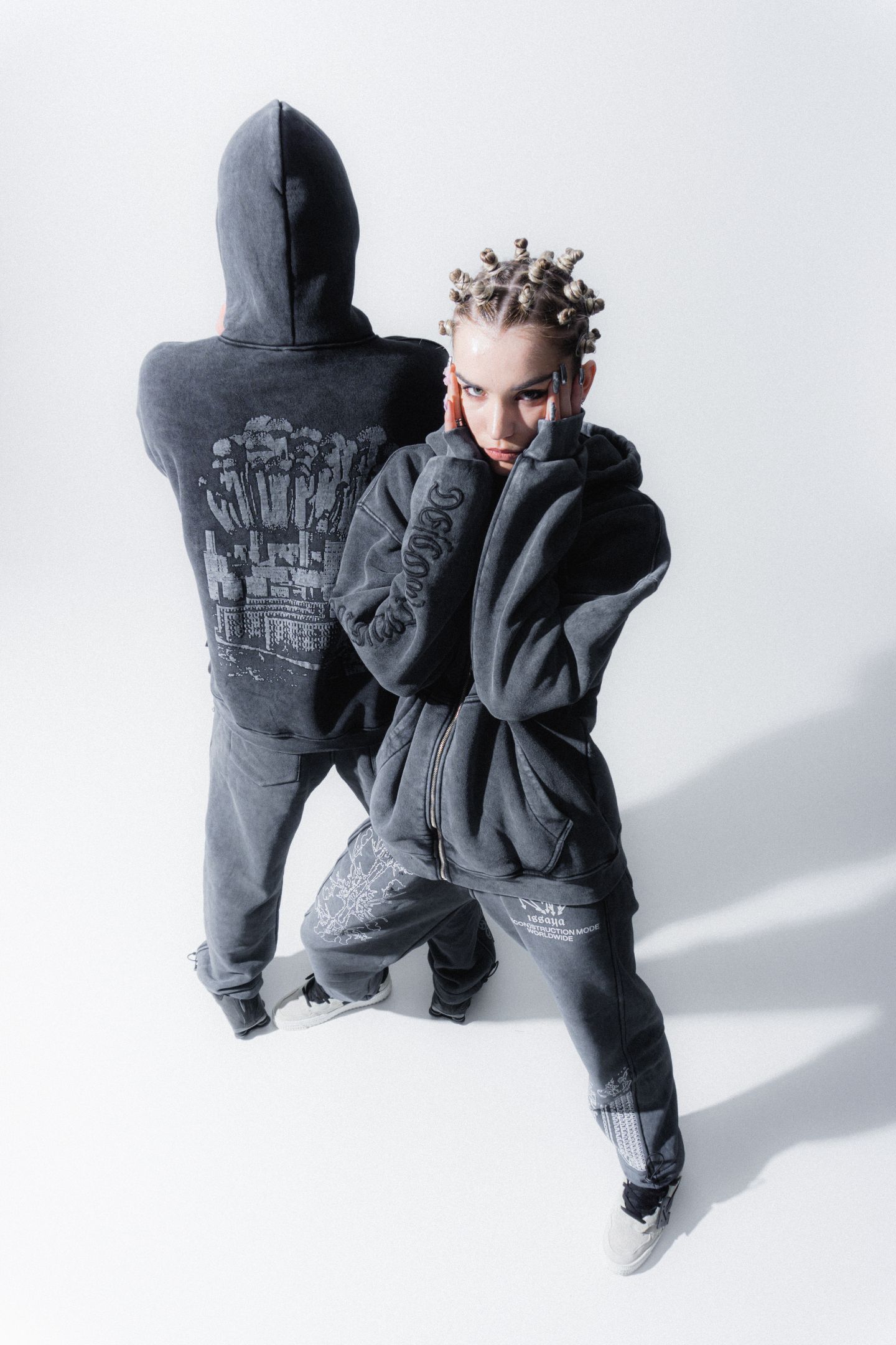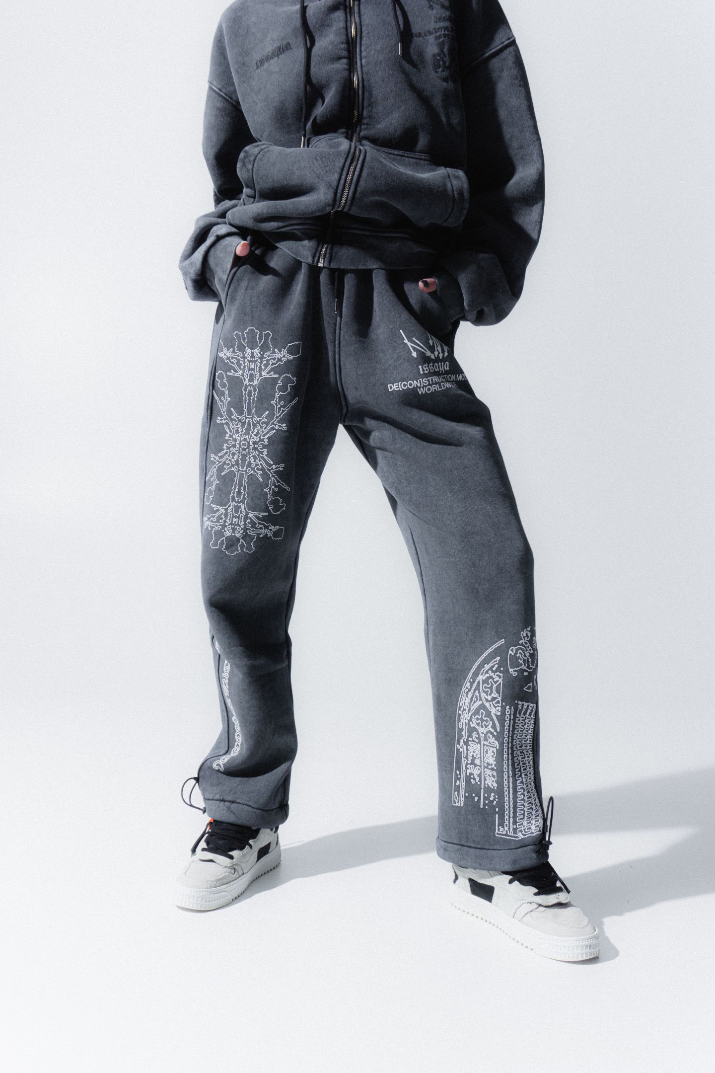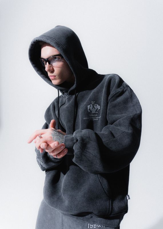 При создании коллекции "De[con]struction" мы использовали одну из самых интересных и необычных технологий обработки ткани — “Stone wash”.